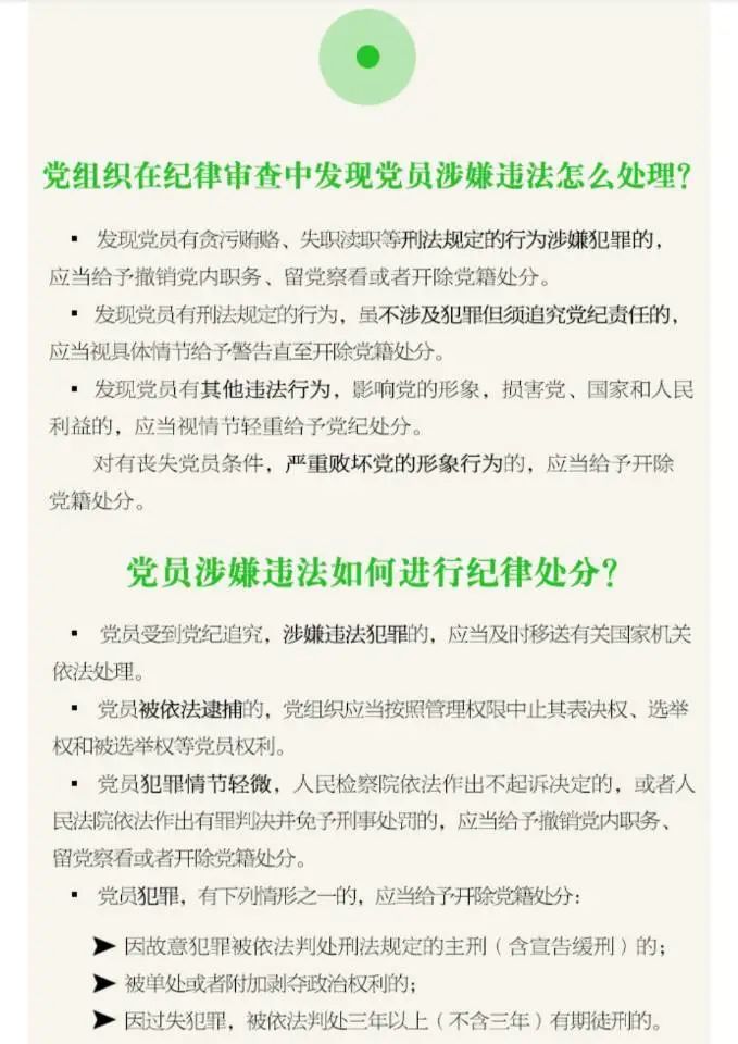 第二十七條 黨組織在紀律審查中發(fā)現(xiàn)黨員有貪污賄賂、濫用職權(quán)、玩忽職守、權(quán)力尋租、利益輸送、徇私舞弊、浪費國家資財?shù)冗`反法律涉嫌犯罪行為的,應當給予撤銷黨內(nèi)職務、留黨察看或者開除黨籍處分。
