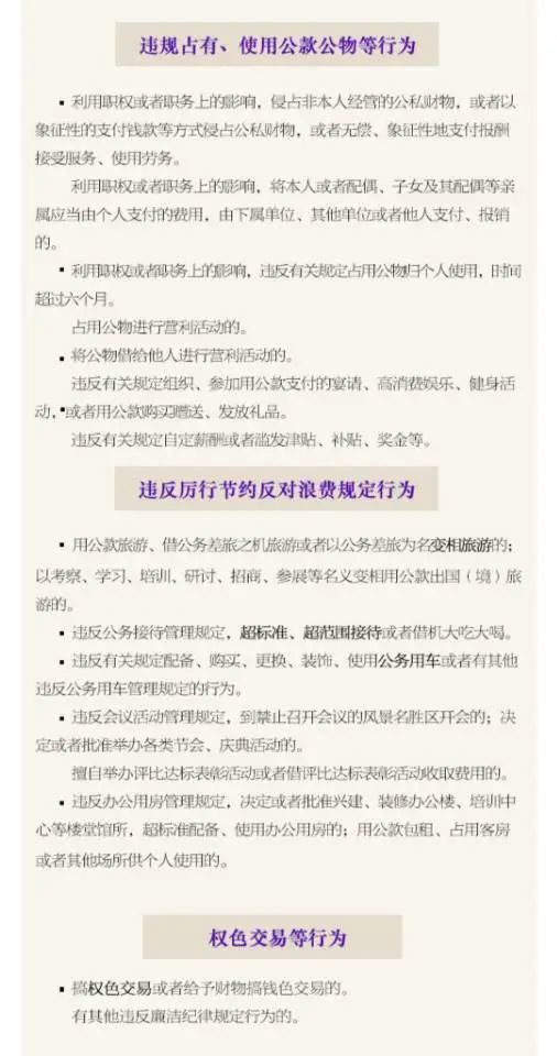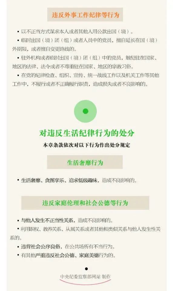本條規(guī)定的“其他嚴重違反社會公德、家庭美德行為”,主要是指本章其他條文未涉及,而又應當受到黨紀責任追究的嚴重違反社會公德、家庭美德的行為,本條是生活紀律的兜底條款。違反本章規(guī)定的行為,與黨員應當遵守的生活紀律要求相比,或者與現(xiàn)實發(fā)生的黨員違反社會公德、家庭美德的道德規(guī)范的行為相比,只是情節(jié)較為嚴重必須予以黨紀處分的一小部分行為。對于大多數(shù)違反道德規(guī)范的行為,靠社會輿論、教育感化等道德自身的力量來糾正和調(diào)整,只有一部分列入黨紀、法律的范圍來進行糾正和調(diào)整。本著紀法分開的原則,對嚴重侵害國家和社會利益以及嚴重侵犯他人權(quán)益的行為,國家法律已將其作為違法犯罪行為進行刑事處罰或者行政處罰。本章未予列入。