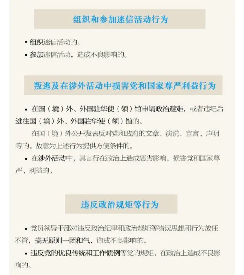 第一百二十二條 有下列行為之一,造成嚴重不良影響,對直接責任者和領導責任者,情節(jié)較輕的,給予警告或者嚴重警告處分;情節(jié)較重的,給予撤銷黨內(nèi)職務或者留黨察看處分;情節(jié)嚴重的,給予開除黨籍處分: