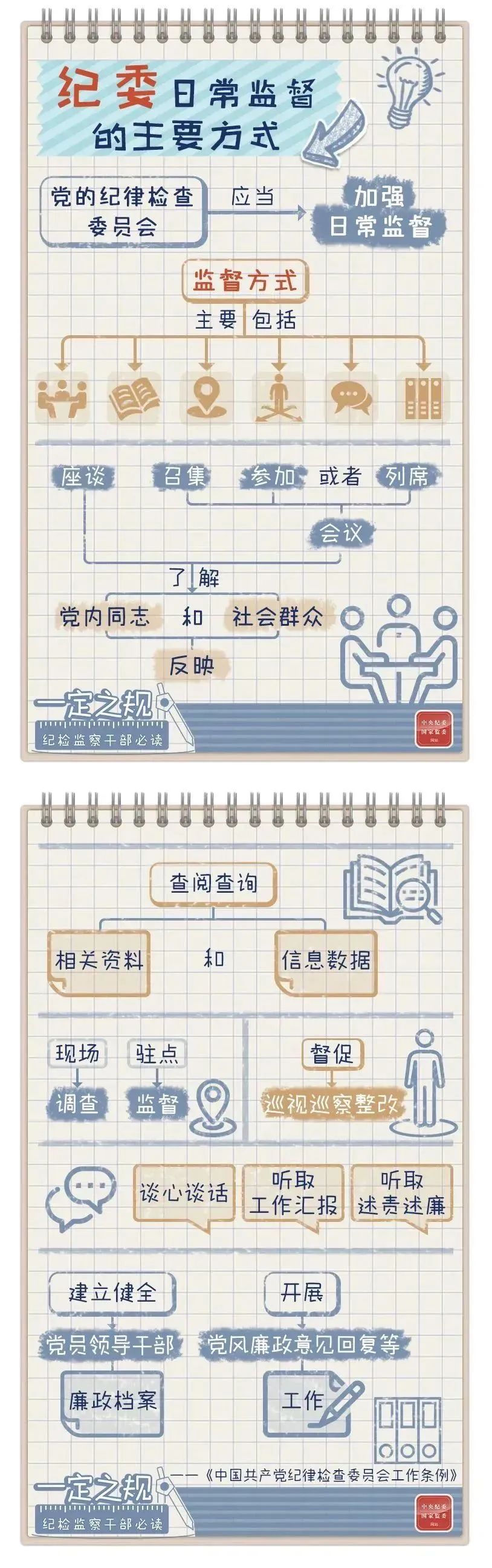 第三十四條 黨的紀(jì)律檢查委員會應(yīng)當(dāng)加強(qiáng)日常監(jiān)督,監(jiān)督方式主要包括:座談,召集、參加或者列席會議,了解黨內(nèi)同志和社會群眾反映;查閱查詢相關(guān)資料和信息數(shù)據(jù);現(xiàn)場調(diào)查,駐點(diǎn)監(jiān)督;督促巡視巡察整改;談心談話,聽取工作匯報(bào),聽取述責(zé)述廉;建立健全黨員領(lǐng)導(dǎo)干部廉政檔案,開展黨風(fēng)廉政意見回復(fù)等工作。