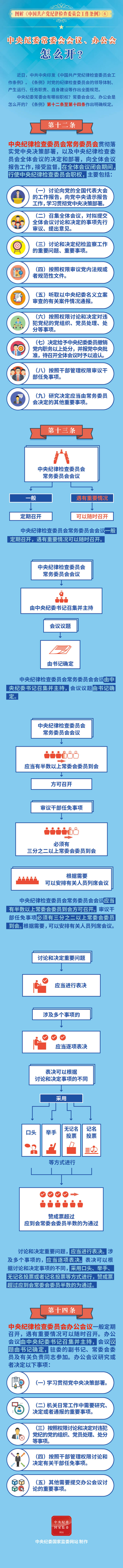 第十四條 中央紀(jì)律檢查委員會辦公會議一般定期召開,遇有重要情況可以隨時(shí)召開。辦公會議由中央紀(jì)委書記召集并主持,會議議題由書記確定,駐委的副書記、常委會委員及有關(guān)負(fù)責(zé)同志參加。辦公會議研究或者決定以下事項(xiàng):