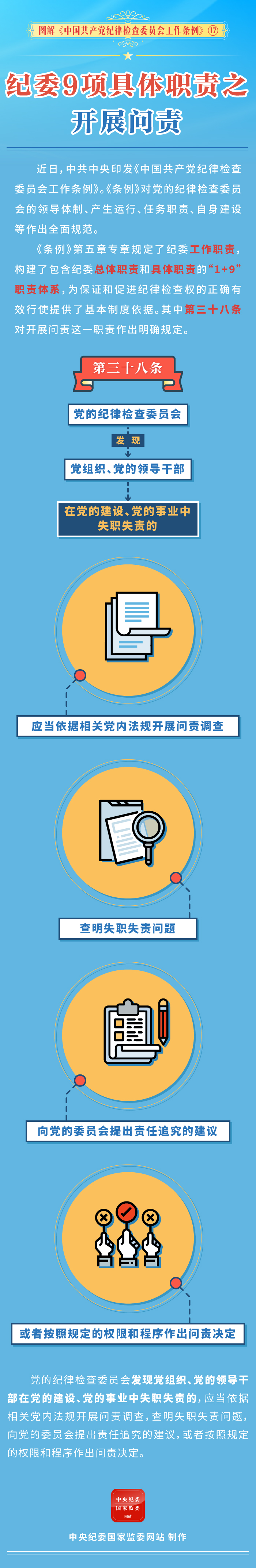第三十八條 黨的紀(jì)律檢查委員會發(fā)現(xiàn)黨組織、黨的領(lǐng)導(dǎo)干部在黨的建設(shè)、黨的事業(yè)中失職失責(zé)的,應(yīng)當(dāng)依據(jù)相關(guān)黨內(nèi)法規(guī)開展問責(zé)調(diào)查,查明失職失責(zé)問題,向黨的委員會提出責(zé)任追究的建議,或者按照規(guī)定的權(quán)限和程序作出問責(zé)決定。