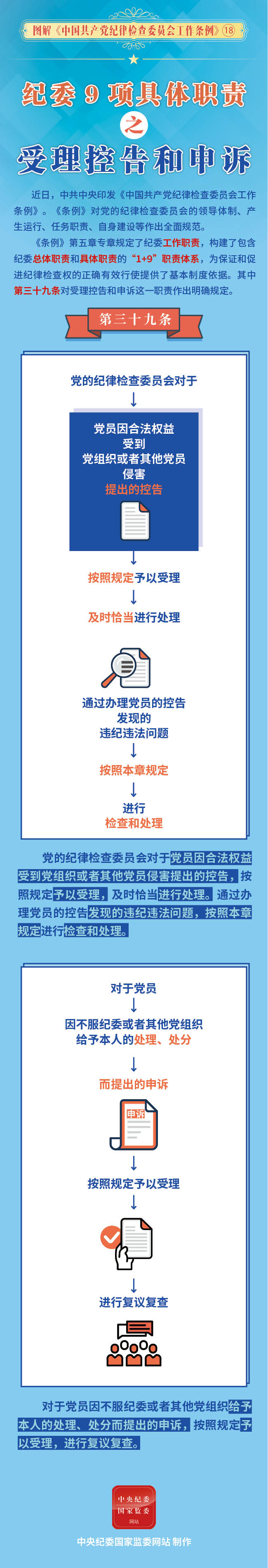 第三十九條 黨的紀(jì)律檢查委員會對于黨員因合法權(quán)益受到黨組織或者其他黨員侵害提出的控告,按照規(guī)定予以受理,及時(shí)恰當(dāng)進(jìn)行處理。通過辦理黨員的控告發(fā)現(xiàn)的違紀(jì)違法問題,按照本章規(guī)定進(jìn)行檢查和處理。