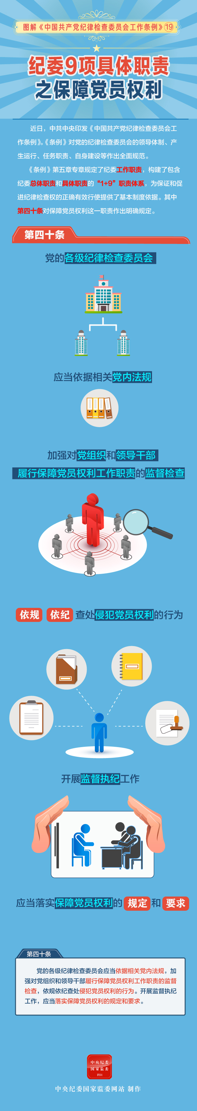 第四十條 黨的各級紀(jì)律檢查委員會應(yīng)當(dāng)依據(jù)相關(guān)黨內(nèi)法規(guī),加強(qiáng)對黨組織和領(lǐng)導(dǎo)干部履行保障黨員權(quán)利工作職責(zé)的監(jiān)督檢查,依規(guī)依紀(jì)查處侵犯黨員權(quán)利的行為。開展監(jiān)督執(zhí)紀(jì)工作,應(yīng)當(dāng)落實(shí)保障黨員權(quán)利的規(guī)定和要求。