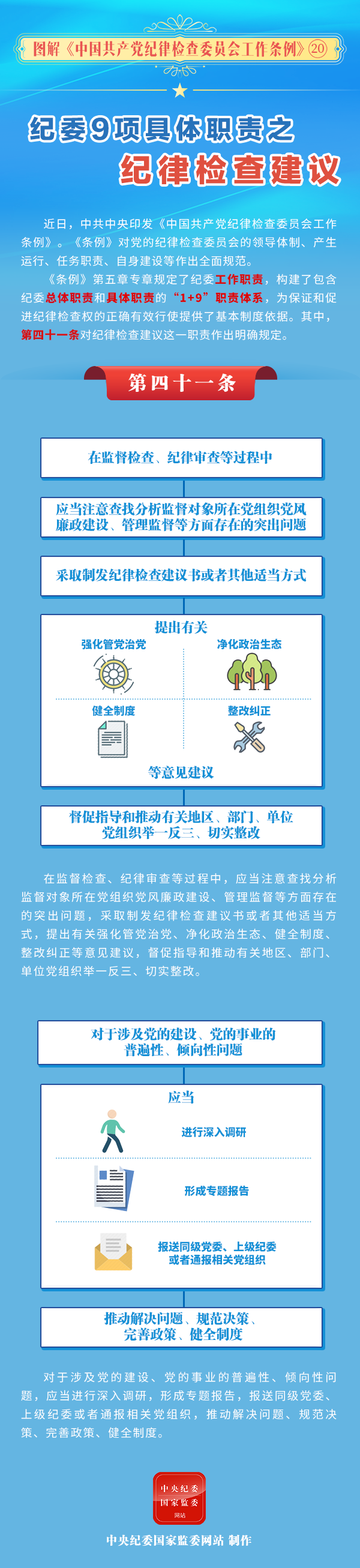 第四十一條 在監(jiān)督檢查、紀(jì)律審查等過程中,應(yīng)當(dāng)注意查找分析監(jiān)督對象所在黨組織黨風(fēng)廉政建設(shè)、管理監(jiān)督等方面存在的突出問題,采取制發(fā)紀(jì)律檢查建議書或者其他適當(dāng)方式,提出有關(guān)強(qiáng)化管黨治黨、凈化政治生態(tài)、健全制度、整改糾正等意見建議,督促指導(dǎo)和推動(dòng)有關(guān)地區(qū)、部門、單位黨組織舉一反三、切實(shí)整改。