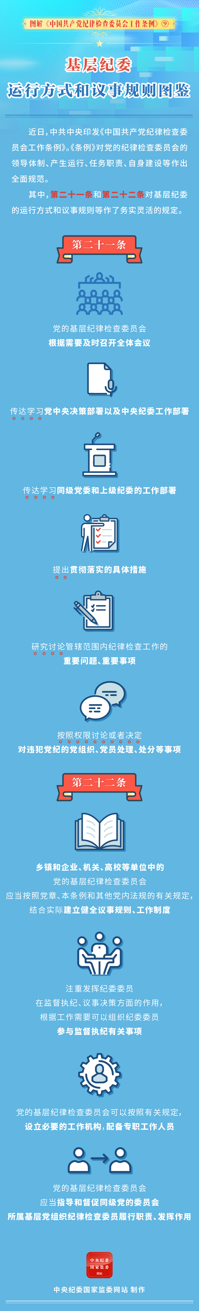 第二十二條 鄉(xiāng)鎮(zhèn)和企業(yè)、機(jī)關(guān)、高校等單位中的黨的基層紀(jì)律檢查委員會應(yīng)當(dāng)按照黨章、本條例和其他黨內(nèi)法規(guī)的有關(guān)規(guī)定,結(jié)合實(shí)際建立健全議事規(guī)則、工作制度,注重發(fā)揮紀(jì)委委員在監(jiān)督執(zhí)紀(jì)、議事決策方面的作用,根據(jù)工作需要可以組織紀(jì)委委員參與監(jiān)督執(zhí)紀(jì)有關(guān)事項(xiàng)。
