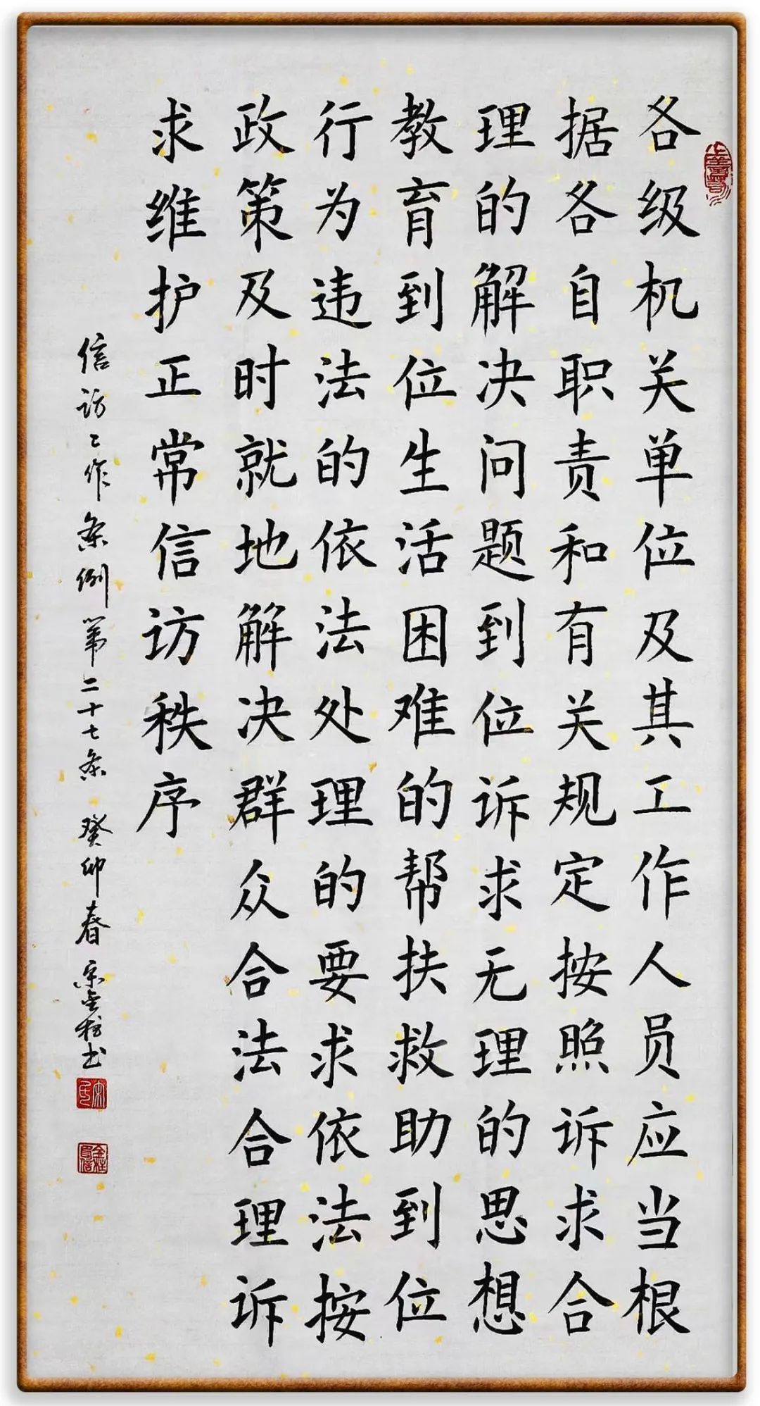 第二十七條 各級(jí)機(jī)關(guān)、單位及其工作人員應(yīng)當(dāng)根據(jù)各自職責(zé)和有關(guān)規(guī)定,按照訴求合理的解決問(wèn)題到位、訴求無(wú)理的思想教育到位、生活困難的幫扶救助到位、行為違法的依法處理的要求,依法按政策及時(shí)就地解決群眾合法合理訴求,維護(hù)正常信訪秩序。