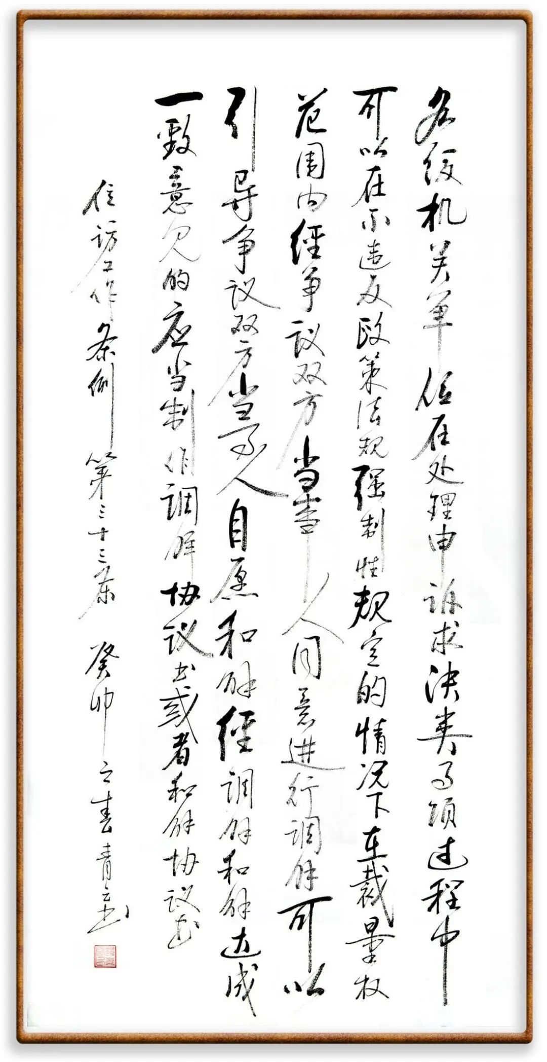 第三十三條 各級(jí)機(jī)關(guān)、單位在處理申訴求決類事項(xiàng)過(guò)程中,可以在不違反政策法規(guī)強(qiáng)制性規(guī)定的情況下,在裁量權(quán)范圍內(nèi),經(jīng)爭(zhēng)議雙方當(dāng)事人同意進(jìn)行調(diào)解;可以引導(dǎo)爭(zhēng)議雙方當(dāng)事人自愿和解。經(jīng)調(diào)解、和解達(dá)成一致意見(jiàn)的,應(yīng)當(dāng)制作調(diào)解協(xié)議書(shū)或者和解協(xié)議書(shū)。