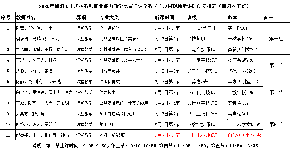 2020年衡陽市教師職業(yè)能力比賽-課堂教學(xué)比賽采用現(xiàn)場聽課方式,現(xiàn)定在6月3日到我校聽課,請各系(院)部通知下表中教師(組),做好參賽準備,按說明要求把聽課班級、教室地點等信息于5月30日報給教務(wù)處羅伏力。
