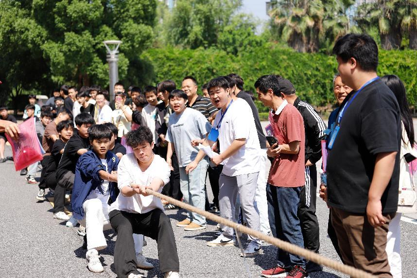 “一、二!拉!”在學(xué)院文化廣場上,一場班級拔河比賽正將現(xiàn)場氣氛推向高潮。2024級的學(xué)生們緊握麻繩,身體向后傾斜,雙腳用力蹬地,全力以赴地向后拉;家長們則在旁為孩子們加油助威,發(fā)出響亮的吶喊聲。