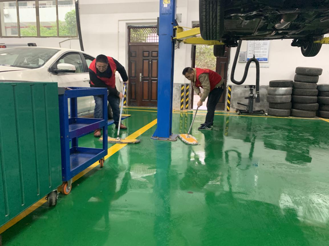 為讓同學們有一個干凈整潔的實訓環(huán)境,教師們分別從實訓中心處領取掃帚、拖把、抹布等清潔工具,分成四個小組在汽車實訓場地打掃衛(wèi)生、擦拭車輛灰塵,規(guī)范工具擺放。