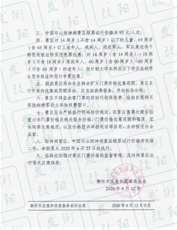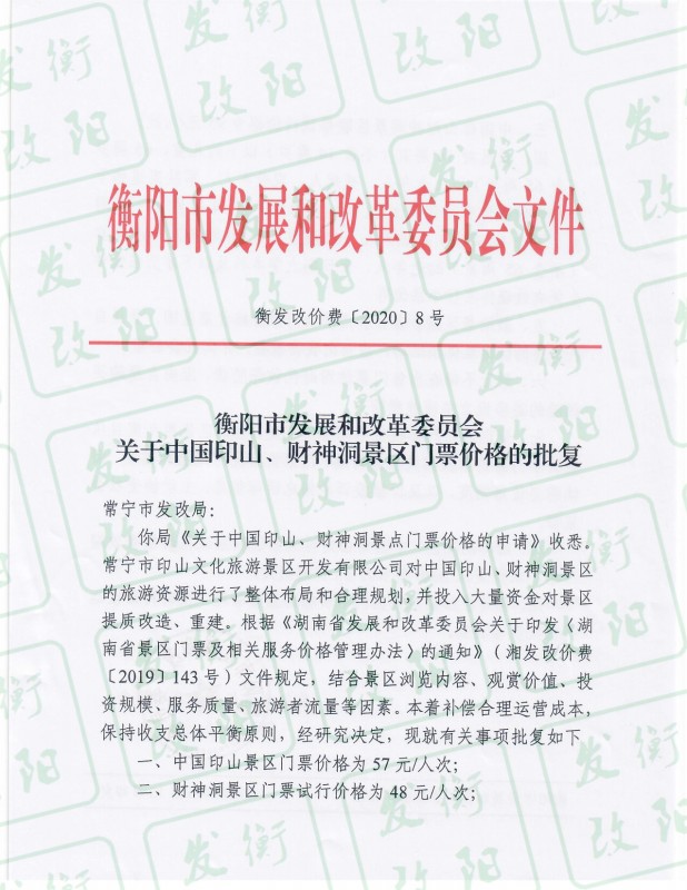 衡陽市發(fā)展和改革委員會(huì)關(guān)于中國(guó)印山、財(cái)神洞景區(qū)門票價(jià)格的批復(fù)