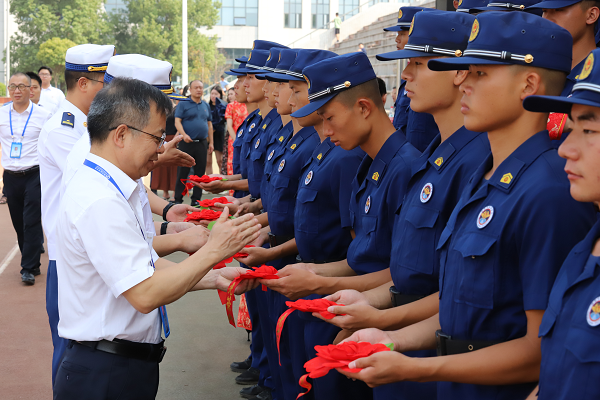 全體領(lǐng)導(dǎo)現(xiàn)場為消防救援專業(yè)定向班隊(duì)員佩戴紅花