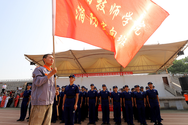 大會上,2021級消防救援專業(yè)定向班學(xué)員向2022級意向班傳遞班旗,全體領(lǐng)導(dǎo)現(xiàn)場為消防救援專業(yè)定向班隊(duì)員佩戴紅花。