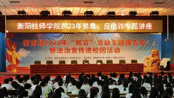 為學習宣傳貫徹習近平法治思想,弘揚法治精神,結合學習貫徹習近平新時代中國特色社會主義思想主題教育,6月6日,學院開展法治宣傳進行校園活動暨2023年禁毒、反電詐專題講座,并聯(lián)合衡南縣政法委舉辦衡陽市、衡南縣法學會“雙百”活動專題報告會。學院黨委副書記、院長廖與飛出席并致辭。衡陽市政法委二級調研員宋景軍,衡南縣委常委、縣委政法委書記蔡志剛出席活動。學院黨委委員、副院長王瀾主持報告會。