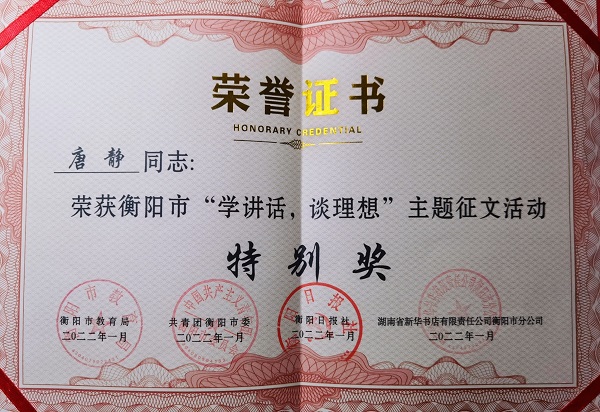 本網(wǎng)訊 3月11日,衡陽市黨史學(xué)習(xí)教育理論征文暨“學(xué)講話,談理想”主題征文評(píng)選活動(dòng)結(jié)果揭曉,我院師生作品喜獲特別獎(jiǎng)1項(xiàng),二等獎(jiǎng)1項(xiàng),三等獎(jiǎng)1項(xiàng),充分展現(xiàn)了學(xué)院黨史學(xué)習(xí)教育的優(yōu)秀成果。