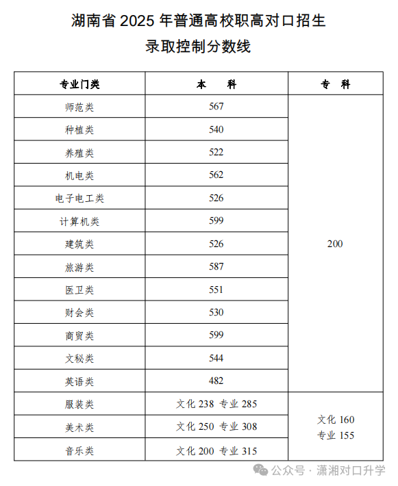 湖南省對口高考2025年本科錄取分?jǐn)?shù)線