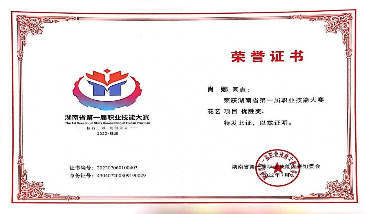 榮獲湖南省第一屆職業(yè)技能大賽花藝項目優(yōu)勝獎