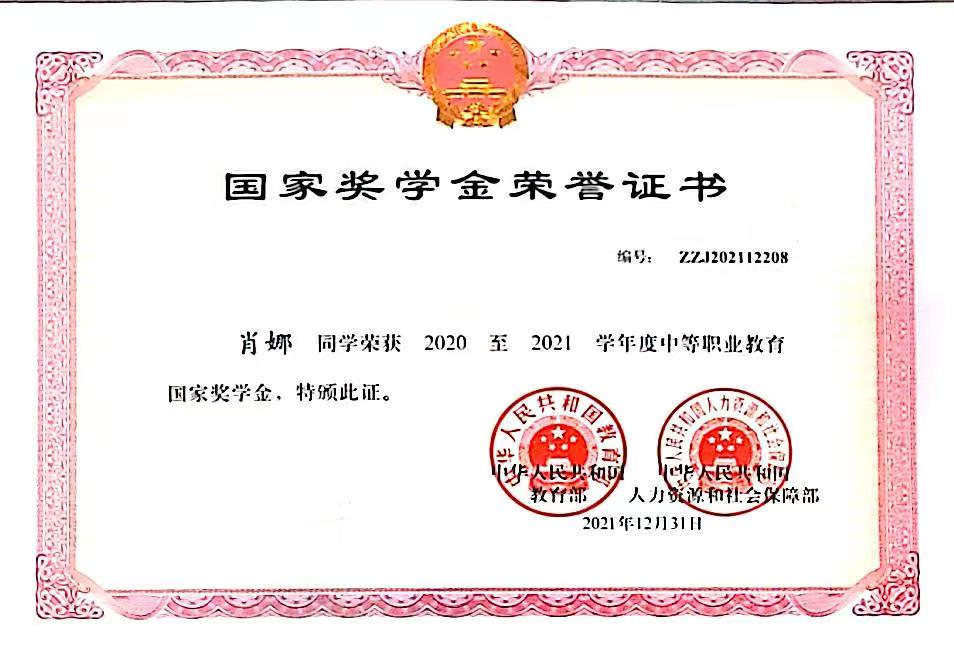 榮獲2020至2021學年度中等職業(yè)教育國家獎學金