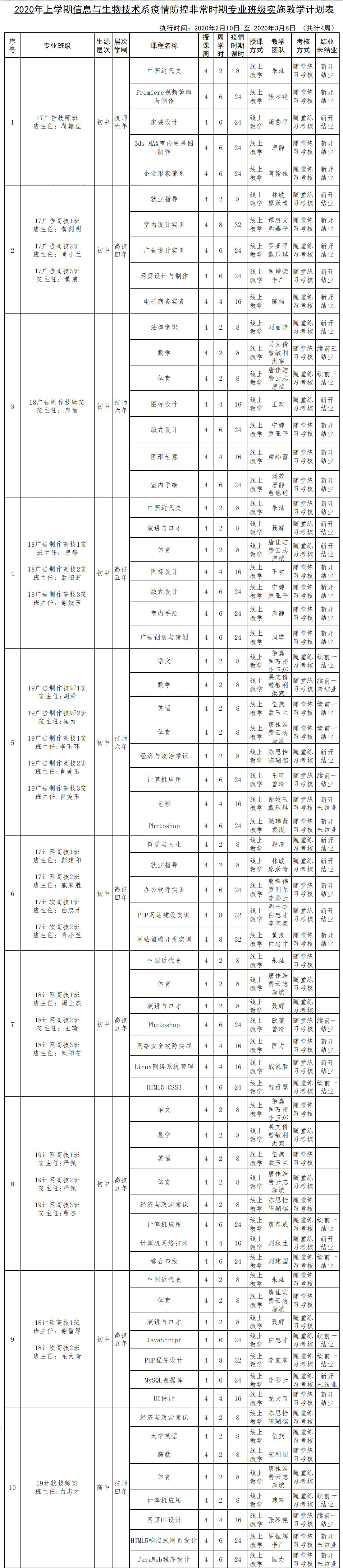 信息系2020年上學(xué)期疫情防控非常時期專業(yè)班級實施性教學(xué)計劃表