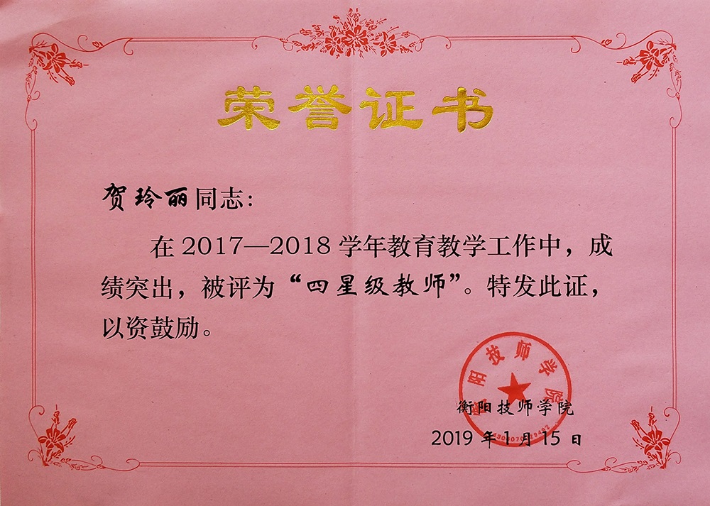 在2018年度中賀玲麗老師教育教學(xué)工作成績突出,被衡陽技師學(xué)院評為了“四星級教師”。