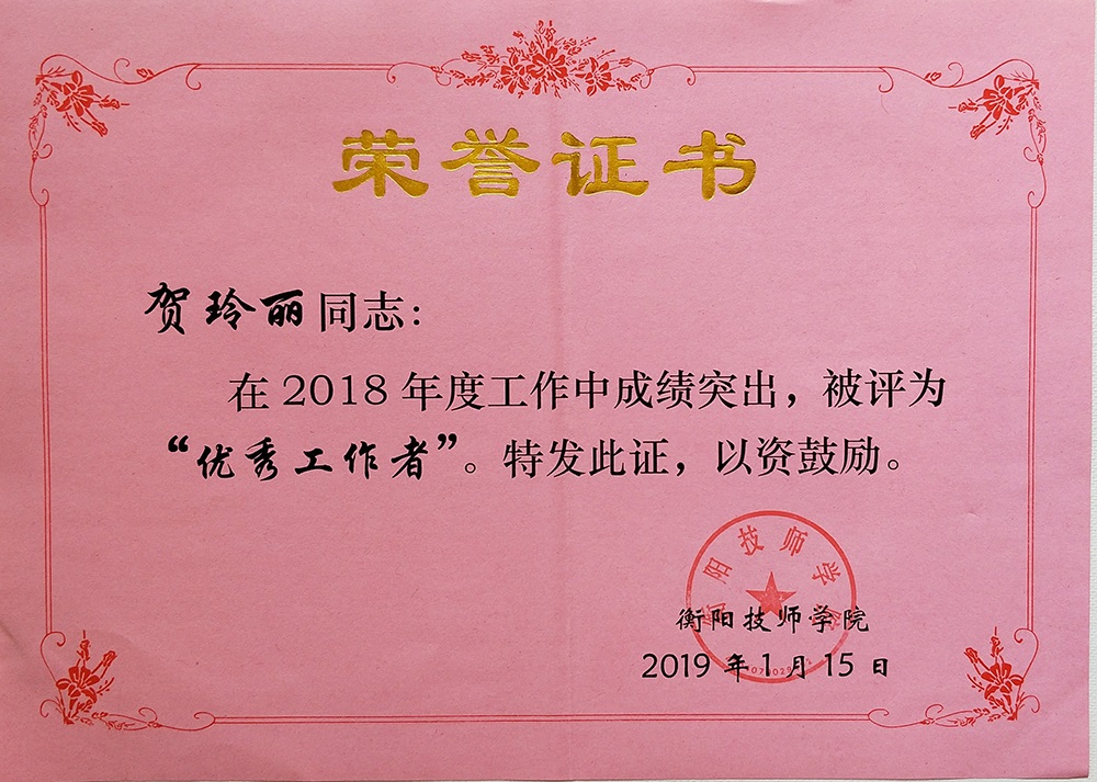 由于2018年度中賀玲麗老師工作成績突出,被衡陽技師學(xué)院評為了“優(yōu)秀工作者”稱號