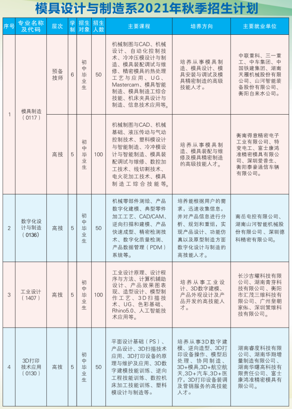 衡陽(yáng)技師學(xué)院2021年秋季模具設(shè)計(jì)與制造系招生簡(jiǎn)章